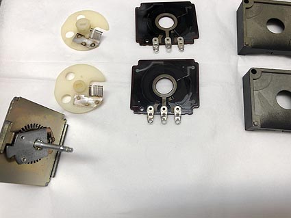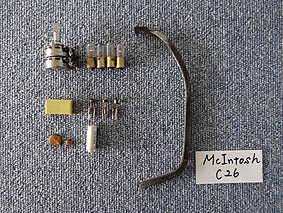 マッキントッシュ Mcintosh c26 修理内容: コンデンサー不良交換 セレクタースイッチ清掃1、フロントパネル清掃 ----------------------------------------------------------------------------- マッキントッシュ Mcintosh c26 2台目 修理内容: メインボリューム交換(800K規格廃止→500K) セレクタースイッチ清掃1、ランプ交換、電源コード交換、フロントパネル清掃 ----------------------------------------------------------------------------- マッキントッシュ Mcintosh c26 症状:ノイズの発生、音の出が不安定になる 原因:部品劣化、汚れ、配線のショート 作業内容:信号経路調査、劣化部品調査修復、測定作業 1:信号経路調査、バランスボリューム部の配線に微細なショート痕、修復 バランスボリューム清掃 2:歪みが不安定に出る。メインボリューム清掃 メイン基板調査 ライン部トランジスタ交換、周辺フィルムコンデンサー交換 3:電源部調査 電源コンデンサー取り外し容量確認 *正常値を確認 4:各スイッチボリューム清掃 INPUTセレクター接点汚れ清掃 MODEセレクター接点汚れ清掃 LOUDNES清掃 5:RCA端子交換(パネル一体型の為、要全数交換) リアパネル分解、配線取り外し、 リアパネル穴加工、RCA端子取り付け交換 6:ACコード新品交換 7:測定作業 残留ノイズ測定、左右音漏れの測定確認 ----------------------------------------------------------------------------------------------- マッキントッシュ Mcintosh C26 症状:ノイズの発生、音の出が不安定になる 原因:部品汚れ 作業内容:信号経路調査、清掃作業、加工作業 1:バランスボリュームの劣化 バランスボリューム清掃、改善するも微細なノイズの発生 バランスボリューム製造廃止入手不可部品につき回路変更、新品ボリュームの加工、ツマミ加工の上新品交換 2:各信号通過部品の清掃 各スイッチボリューム清掃 メインボリューム清掃(電源スイッチ一体型) INPUTセレクター接点汚れ清掃 MODEセレクター接点汚れ清掃 LOUDNES清掃 3:フロントパネル分解、清掃、LED加工 |